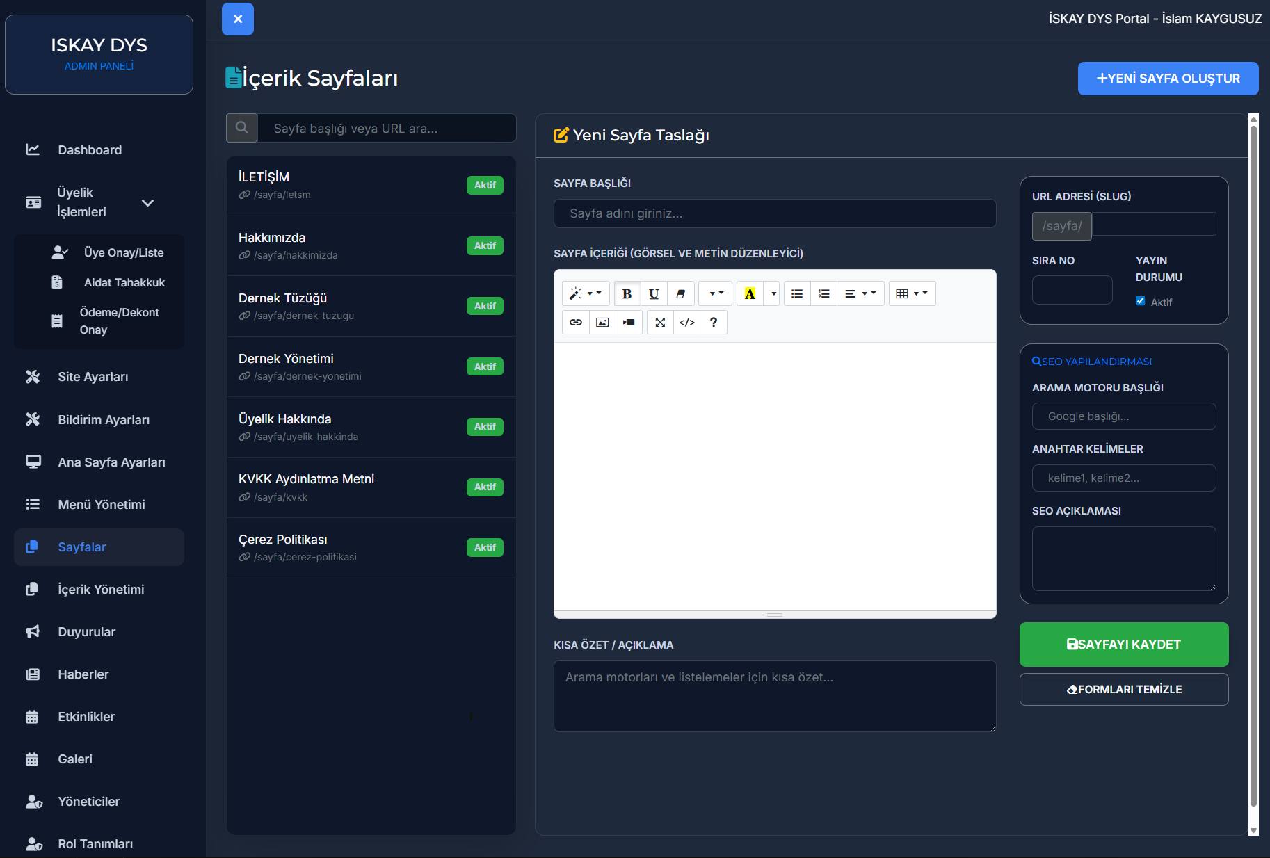 Sitedeki menülerin yerleşiminden, sosyal medya linklerine; logodan, iletişim bilgilerine kadar her şey panelden yönetilebilir. Bir geliştiriciye ihtiyaç duymadan "Hakkımızda", "Tüzük", "Yönetim Kurulu" gibi kurumsal sayfalarınızı kendiniz oluşturabilir ve güncelleyebilirsiniz.