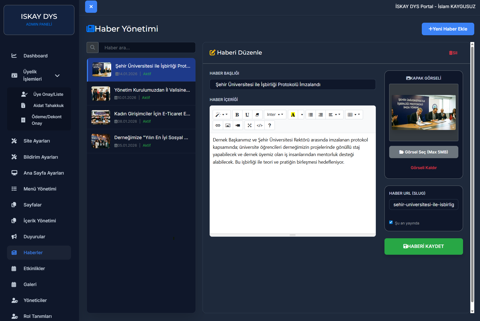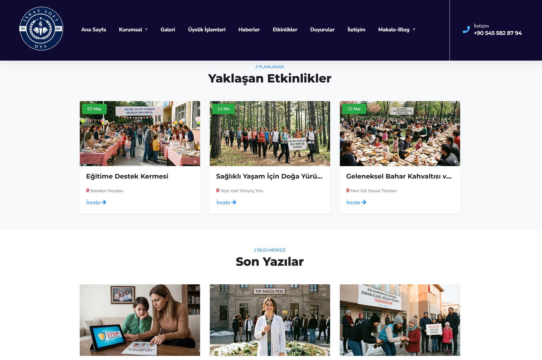Derneğinizdeki gelişmeleri, ziyaretlerinizi veya basında çıkan haberlerinizi kolayca ekleyin. Eklediğiniz haberler otomatik olarak ana sayfada listelenir. Ayrıca önemli haberlerinizi , ana sayfadaki büyük Slider alanında, yüksek çözünürlüklü görsellerle dikkat çekici bir şekilde sergileyebilirsiniz.