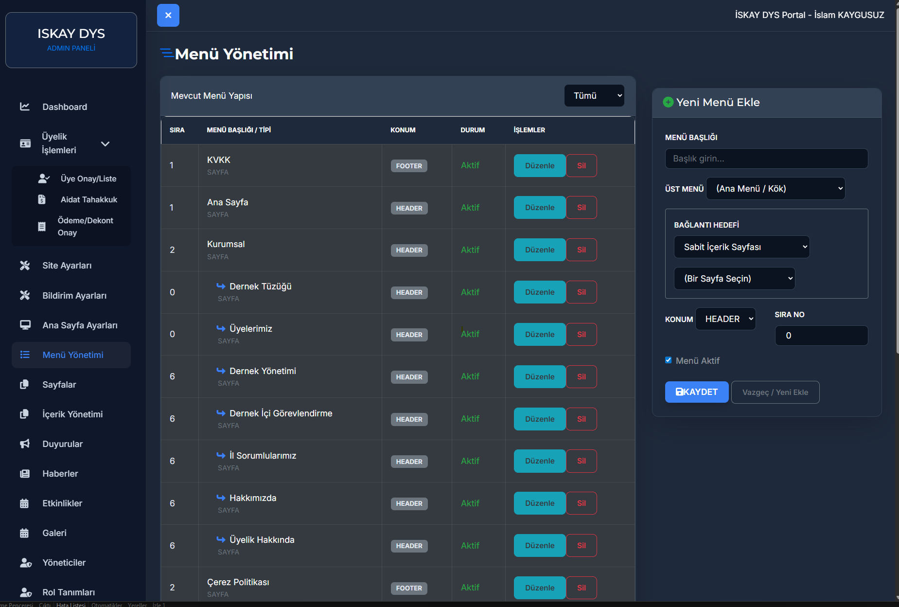 Sitedeki menülerin yerleşiminden, sosyal medya linklerine; logodan, iletişim bilgilerine kadar her şey panelden yönetilebilir. Bir geliştiriciye ihtiyaç duymadan "Hakkımızda", "Tüzük", "Yönetim Kurulu" gibi kurumsal sayfalarınızı kendiniz oluşturabilir ve güncelleyebilirsiniz.