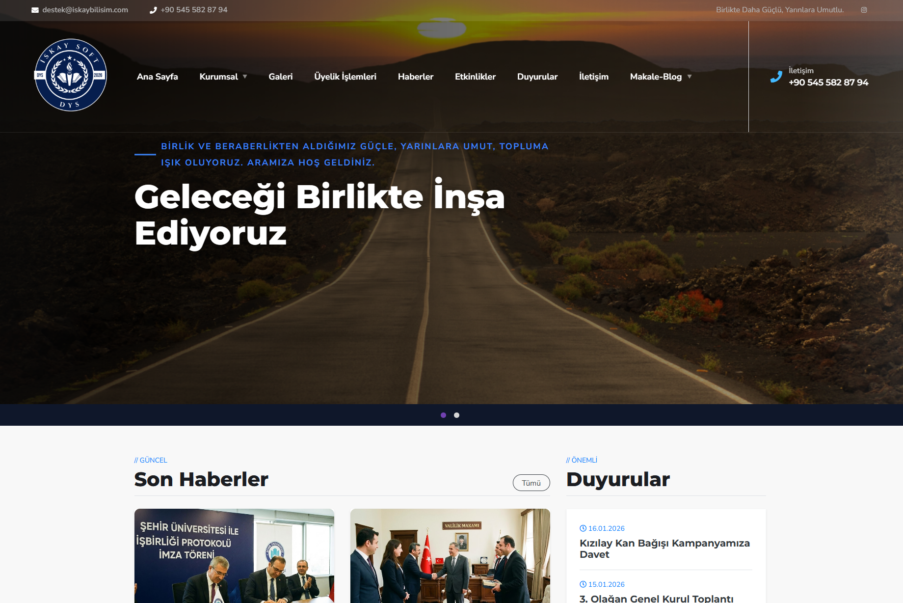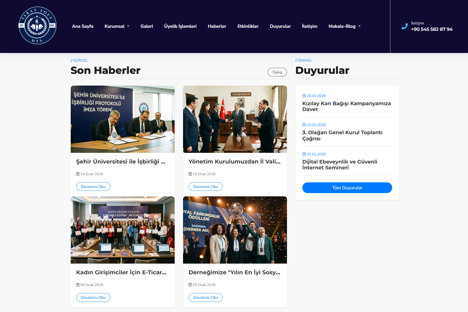 Derneğinizdeki gelişmeleri, ziyaretlerinizi veya basında çıkan haberlerinizi kolayca ekleyin. Eklediğiniz haberler otomatik olarak ana sayfada listelenir. Ayrıca önemli haberlerinizi , ana sayfadaki büyük Slider alanında, yüksek çözünürlüklü görsellerle dikkat çekici bir şekilde sergileyebilirsiniz.